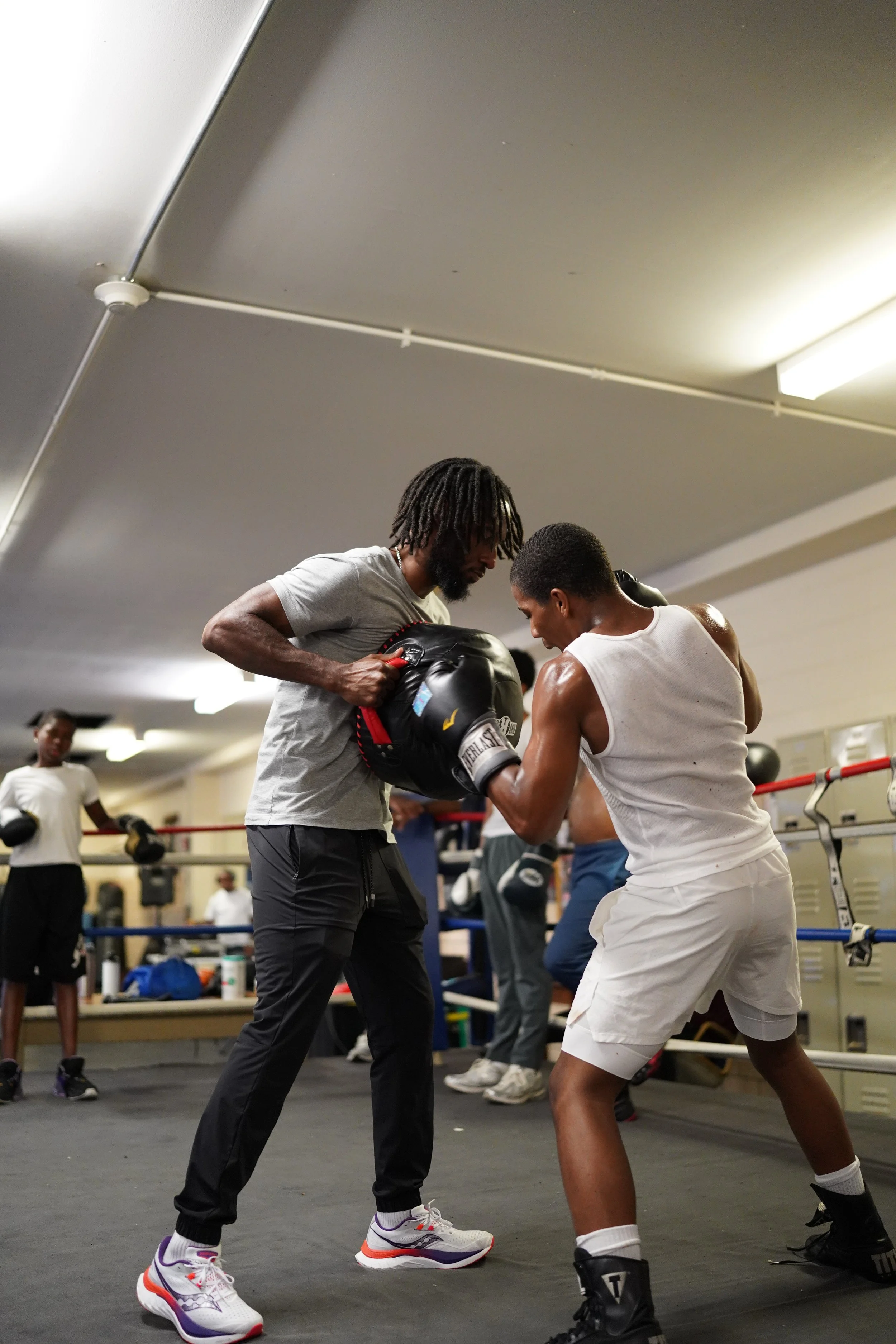 Every session begins with a jump rope warmup to get the body moving, followed by a team huddle in the ring. Coaches lead a short mentorship talk around a themed topic—building character, discipline, and confidence before the workout begins.